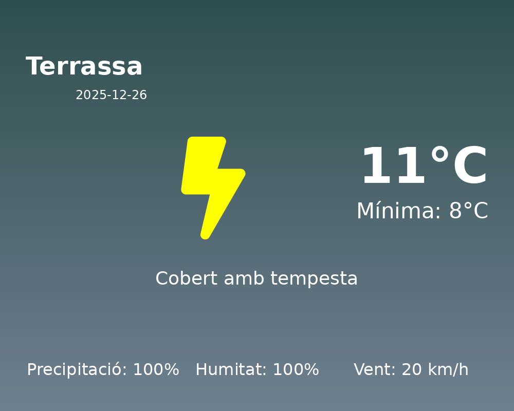 Benvinguts al nostre informe meteorològic diari per a la ciutat de Terrassa. Avui, les condicions meteorològiques estan marcades per una jornada predominantment humida i plujosa.